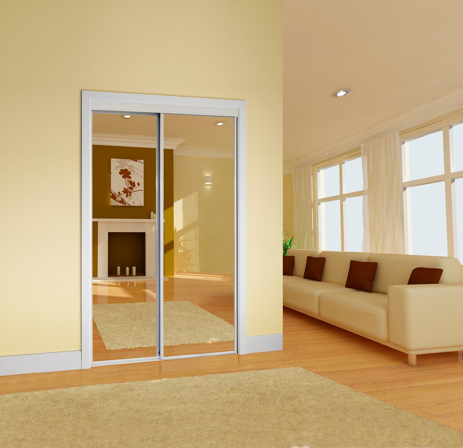 Sliding doors with 1 1/4" metal frame available in several finishes. Mirror or opaque glass inserts, your choice. Non-standard height on request (rolling from below.)