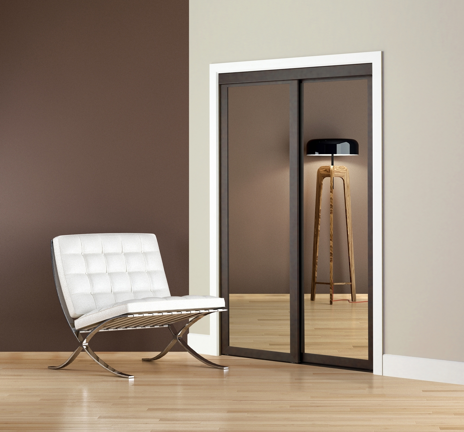 Sliding doors with contemporary 2 1/2" frame. Choice of mirror, glass or wood-finish panel inserts. Folding version also available.