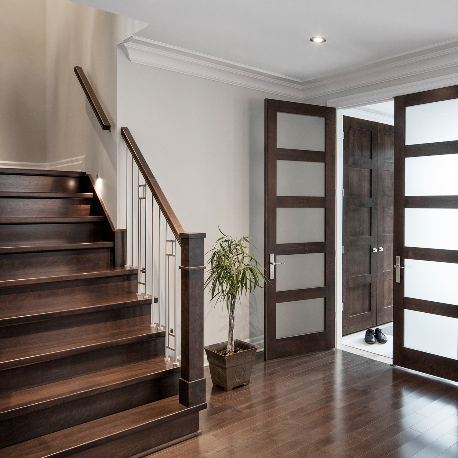 Barreau en métal de style contemporain à double tige. Tige carrée de 1/2 po. Agencement avec ou sans insertions de verre. Hauteur muret en commande spéciale.
