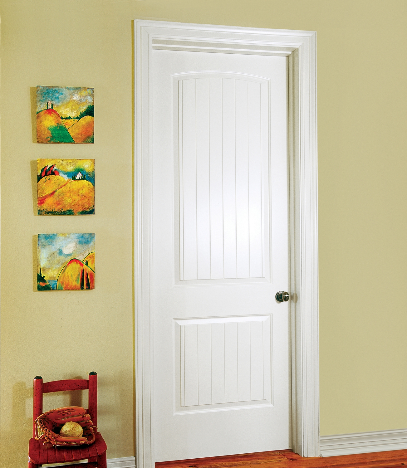 Modèle à 2 panneaux moulés, haut arqué et effet lambris. Surface lisse, prépeinte. Hauteurs non standards offertes sur demande.