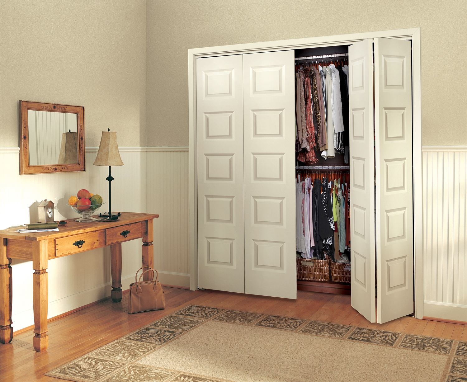 Porte à panneaux moulés et surface lisse, prépeinte. Âme creuse ou pleine, au choix. Version pliante et hauteurs non standard aussi offertes.