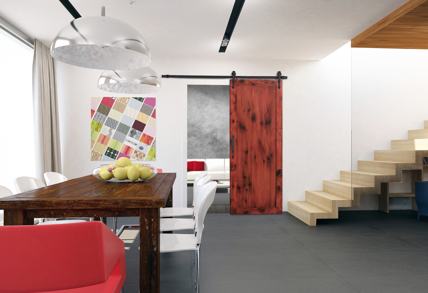 Ensemble comprenant barre plate et quincaillerie en acier peint noir. Roulement à billes silencieux. Convient aux portes jusqu'à 37 po. Poids maximal : 150 lb  (possibilité d'ajouter un deuxième système pour ouvertures plus grandes).